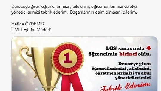 LGS 2022’de Türkiye genelinde 193 Türkiye birincisi çıktı. Bu öğrencilerin 4’ünün Malatya’dan olduğu belirtildi. Malatya İl Milli Eğitim Müdürü Hatice Özdemir, sosyal medyada yaptığı açıklamada, “LGS sınavında 4 öğrencimiz birinci oldu. Dereceye giren öğrencilerimizi, ailelerini, öğretmenlerimizi ve okul yöneticilerimizi tebrik ederim. Başarılarının daim olmasını dilerim” ifadelerine yer verdi.