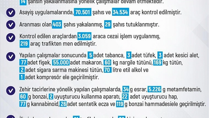 Elazığ Valisi Numan Hatipoğlu, son 1 haftalık asayiş verilerini paylaştı. Buna göre son bir hafta içerisinde 229 olay meydana gelirken, 225 şahıs yakalandı. Şahıslardan 11'i ise tutuklanarak cezaevine gönderildi. Asayiş uygulamalarında 70 bin 501 şahıs ve 34 bin 534 araç kontrol edildi. Aranması olan 403 şahıs yakalanırken, 29 şahıs tutuklanarak cezaevine gönderildi. Kontrol edilen araçlardan 3 bin 59 araca cezai işlem uygulanırken 219 araç trafikten men edildi. Yapılan çalışmalar sonucunda 5 tabanca, 3 tüfek, 3 kesici alet, 77 adet fişek, 55 bin adet makaron, 60 kilo nargile tütünü, 169 kilo tütün, 2 adet sigara sarma makinesi, 70 litre etil alkol ve 1 kompresör ele geçirildi.