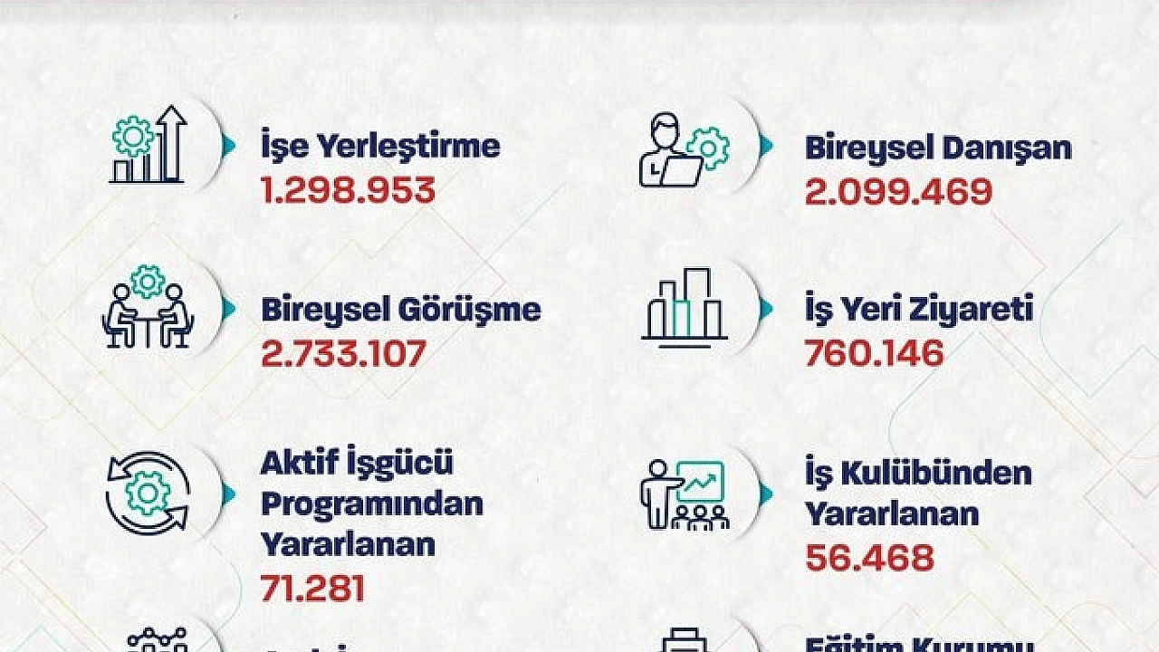 "Bu amaçla ocak-ekim ayları arasında önemli adımlar attık. 1 milyon 298 bin 953 işe yerleştirmeye aracılık ettik. 2 milyon 733 bin 107 bireysel görüşme ve 760 bin 146 iş yeri ziyareti gerçekleştirdik. Tüm bu süreçte toplam 2 milyon 101 bin 49 açık iş (işveren tarafından talep edilen-ihtiyaç duyulan eleman) tespit ettik. Ülkemizin kalkınmasına katma değer sağlayan her bir vatandaşımızın yanında olmaya devam edeceğiz."