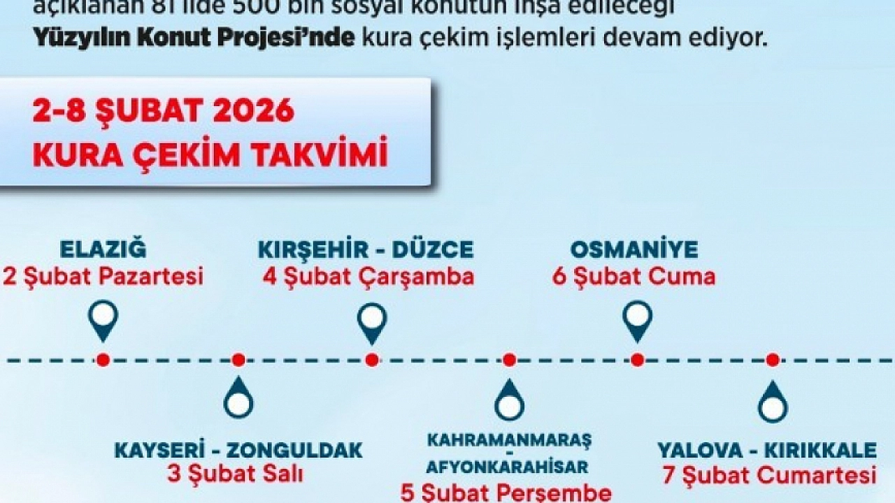 2-8 Şubat haftası takvimine göre; 2 Şubat Pazartesi Elazığ’da 3 bin 825, 3 Şubat Salı Kayseri’de 7 bin 562, Zonguldak’ta bin 872, 4 Şubat Çarşamba Kırşehir’de bin 633, Düzce’de 2 bin 470, 5 Şubat Perşembe Kahramanmaraş’ta 8 bin 195, Afyonkarahisar’da 4 bin 370, 6 Şubat Cuma Osmaniye’de 2 bin 990, 7 Şubat Cumartesi Yalova’da bin 805, Kırıkkale’de bin 736 konut için kura çekimi yapılacak. Böylece 2-8 Şubat haftasında toplam 36 bin 458 sosyal konutun daha hak sahipleri belirlenecek.
