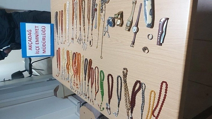 Olay, Akçadağ ilçe Merkezi Yarbay Songül Yakut Caddesi üzerinde bulunan bir iş yerinde meydana geldi. Edinilen bilgilere göre; Ç.Ö.’ye ait olan iş yerine gecenin ilerleyen saatlerinde gelen şüpheli üst katta bulunan balkonun camında girdiği iş yerinde önceden gözüne kestirdiği 80 adet yaklaşık 200 bin TL değerinde olan tespih koleksiyonunu çalarak uzaklaştı. Sabah saatlerinde iş yerine gelen Ç.Ö. tespihlerin yerinde olmadığını fark edince durumu polis ekiplerine bildirdi. Olayla ilgili olarak çalışma başlatan Akçadağ ilçe Emniyet Müdürlüğü ekipleri hırsızın yakalanması çevredeki bina ve iş yerlerinin güvenlik kamerası kayıtlarını incelemeye aldı. Yapılan incelemelerde hırsızlık şüphelisinin M.G. olduğunu tespit eden ekipler şahsı evinde gözaltına aldı. Emniyetteki sorgusunda suçunu itiraf eden M.G. çaldığı tespihleri Kasımusağı Mahallesi -Kürecik radarı mevkiinde kayalar arasına sakladığını ifade etmesi üzerine bölgeye giden ekipler çalıntı tespihleri belirtilen noktada bularak muhafaza altına aldı.