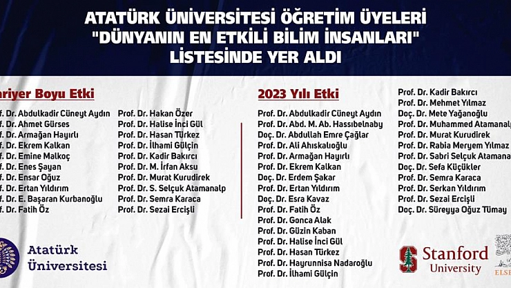 Söz konusu liste, kariyer boyu ve son yıl olmak üzere iki farklı kategoride açıklanırken, Atatürk Üniversitesinden 28 bilim insanı, “Son Yıl” bilim insanları listesine, 20 bilim insanı ise “Kariyer Boyu Etki” listesine girmeye hak kazandı. Türkiye genelinde ise 1518 araştırmacı “son yıllık” listede, 1172 bilim insanı ise “kariyer boyu” listede yer alarak önemli bir başarıya imza attı.