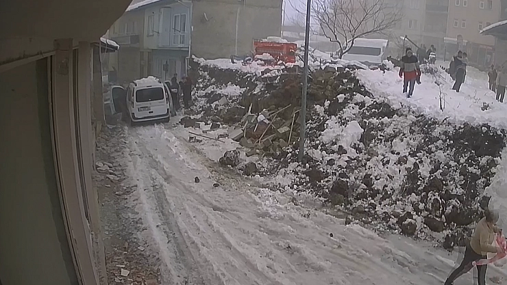 Görüntüde sarsıntı nedeniyle çevredeki vatandaşların kaçışması ve arka tarafta kerpiç bir binanın yıkılması nedeniyle oluşan toz bulutu yer alıyor.