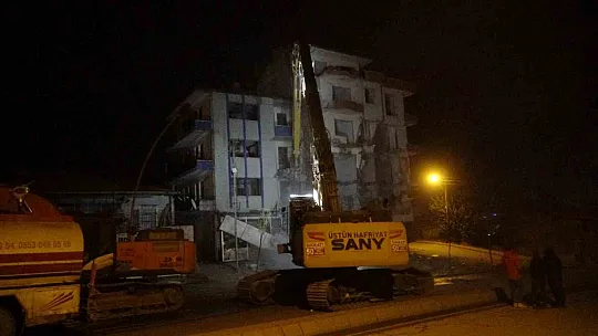 Malatya'da ağır hasarlı bir bina, yıkım işlemleri sırasında yola devrildi.