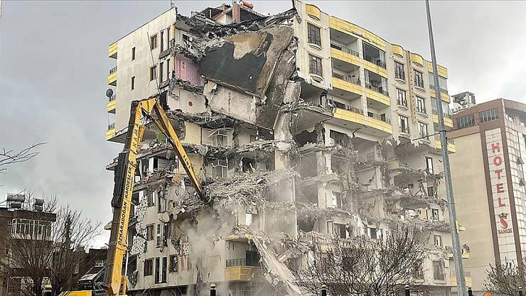 Kahramanmaraş merkezli 6 Şubat 2023'teki depremlerden etkilenen Adıyaman'ın Besni ilçesinde ağır hasarlı binaların yıkımı sürüyor.
