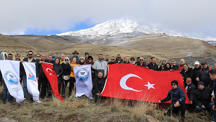 Akademisyenler, bölgede son günlerde etkili olan kar yağışının ardından beyaza bürünen dağın 2 bin 800 rakımında vakit geçirip, Türk bayrağıyla fotoğraf çektirdi.