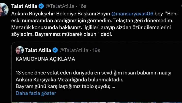 Atilla, sosyal medya hesabından yaptığı son paylaşımda ise kendisini Ankara Büyükşehir Belediye Başkanı Mansur Yavaş'ın aradığını söyleyerek, "Beni eski numaramdan aradığınız için görmedim. Telaştan geri dönemedim. Mezarlık konusunda haklısınız. İlgilileri arayıp sizden özür dilemelerini söyledim. Bayramınız mübarek olsun" ifadelerini kullandı.