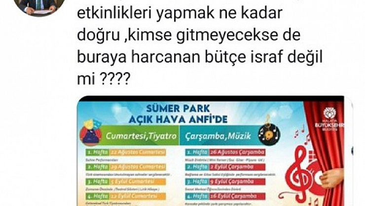 Konuyla ilgili sosyal medya hesabın paylaşımda bulunan Yeniden Refah Partisi İl Başkanı Bilal Yıldırım, "Malatya'mızda hastalık artmışken, bu etkinlikleri yapmak ne kadar doğru, kimse gitmeyecekse de buraya harcanan para israf değil mi???" paylaşımında bulundu.