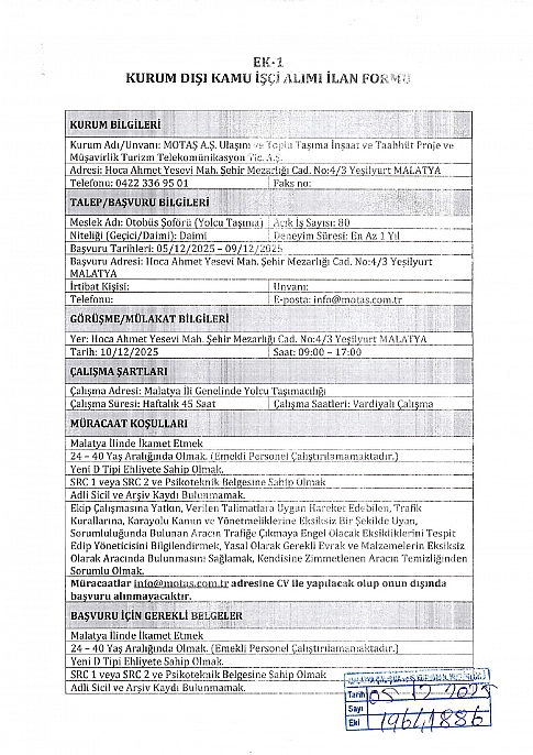 Malatya Büyükşehir Belediyesi'nin iştiraklerinden MOTAŞ, toplu ulaşım filosunda görev yapmak üzere İŞKUR aracılığıyla 80 daimi otobüs şoförü alımı gerçekleştirecek.