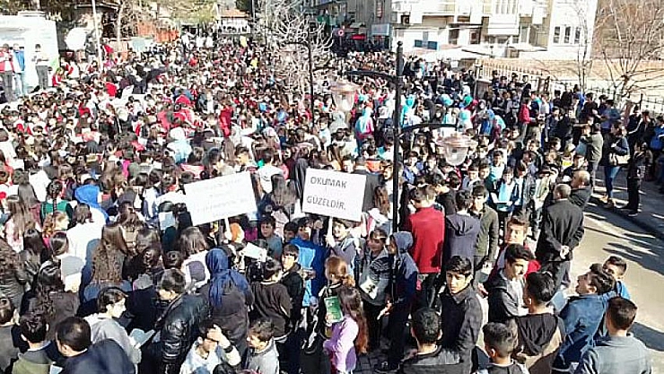 Malatya'nın Doğanşehir ilçesinde '55. Kütüphane Haftası' kapsamında yaklaşık 3 bin öğrenci, caddeyi trafiğe kapatarak 40 dakika boyunca kitap okudu.