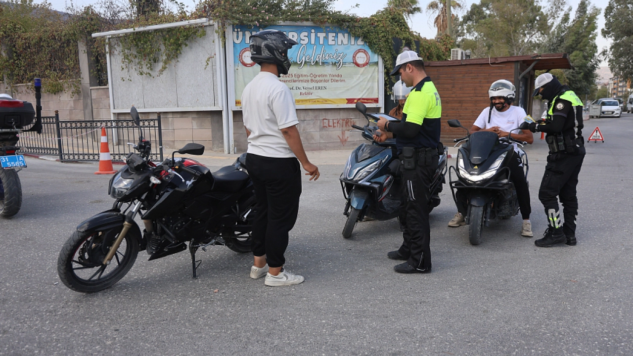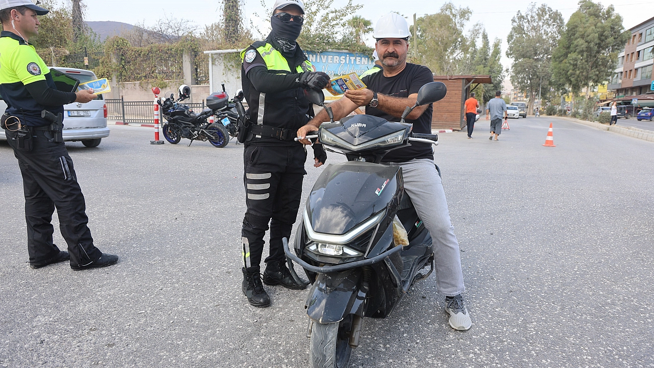 Hatay Emniyet Müdürlüğü Bölge Trafik Denetleme Şube Müdürlüğü ekiplerinin, kentte kazaların çoğunluğunu oluşturan motosiklet kazalarını önlemek için çalışmaları aralıksız sürüyor. Trafik polisi ekiplerince; Antakya ilçesi Zülüflühan Mahallesi Mustafa Kemal Üniversitesi önünde motosiklet sürücülerine yönelik denetim yapıldı ve kask takmanın önemi dağıtılan broşürlerle ve sözlü olarak anlatıldı. Denetimlerde; motosiklet araçların plakaları, muayeneleri ve sürücülerin kask kullanımına yönelik denetim gerçekleşti. Denetimler esnasında motosiklet sürücüleri, kendilerine sorulan ‘kask sizin için ne anlam ifade ediyor’ sorusuna cevap verdiler. Ekmek parasını motosikletli kurye olarak kazanan Yahya Siper'in, evde bekleyen 2 çocuğu ve eşi için hayatta kalmak için kask taktığını söylemesi dikkat çekti.