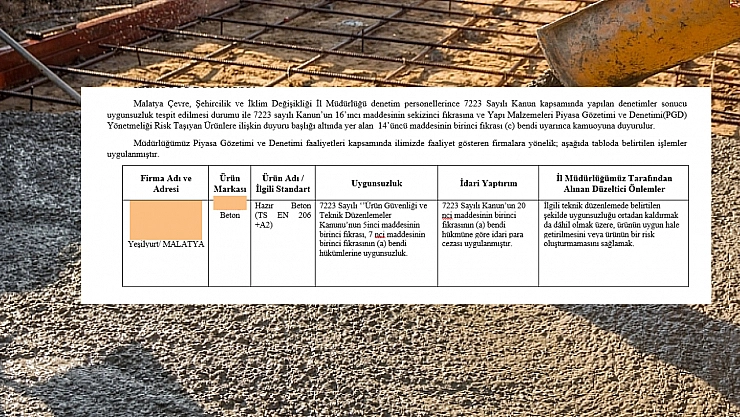 6 Şubat depremlerinin ardından yeniden inşa sürecine giren Malatya’da, yapı güvenliği konusunda hassasiyet artarken, denetim ekipleri beton kalitesini mercek altına aldı. Malatya Çevre, Şehircilik ve İklim Değişikliği İl Müdürlüğü tarafından yapılan piyasa gözetimi ve denetimleri sonucunda bir beton firmasının ürünlerinde 7223 Sayılı Ürün Güvenliği ve Teknik Düzenlemeler Kanunu'nun 5inci maddesinin birinci fıkrası, 7.nci maddesinin birinci fıkrasının (a) bendi hükümlerine uygunsuzluk tespit edildi.