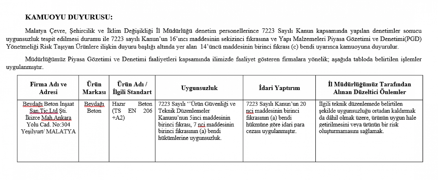 Çevre Şehircilik Affetmedi… Malatya'da Beton Firmasına Ceza!