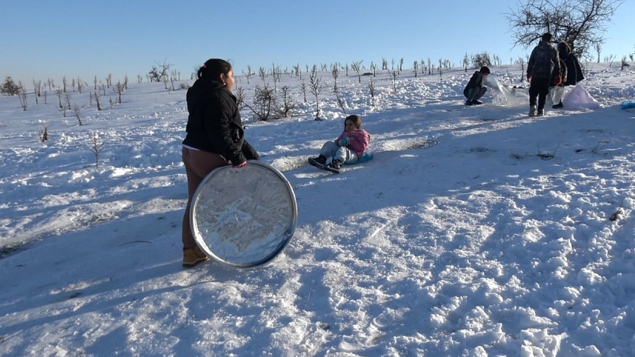 Kar yağışı sonrası mahalledeki engebeli boş araziyi kayak pistine çeviren çocuklar, doyasıya eğlendi. Kar yağışıyla beyaza bürünen tepe, hem çocukların hem de ailelerin eğlence noktası oldu. Tepede yoğunluk oluşturan, naylon, leğen ve tepsilerle kayan çocuklar, doyasıya eğlendi. Boş arazideki tepeyi kendi imkanlarıyla düzelterek kızak pistine çeviren çocuklar, naylon, tepsi ve leğenlerle kayarak keyifli anlar yaşadı.