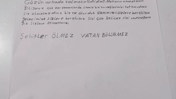 Şehitlere seslenen bir başka çocuk ise, "Siz her zaman bizim kalbimizdesiniz, inşallah bir gün cennette buluşuruz. Şehitler ölmez vatan bölünmez" ifadelerini kullandı.