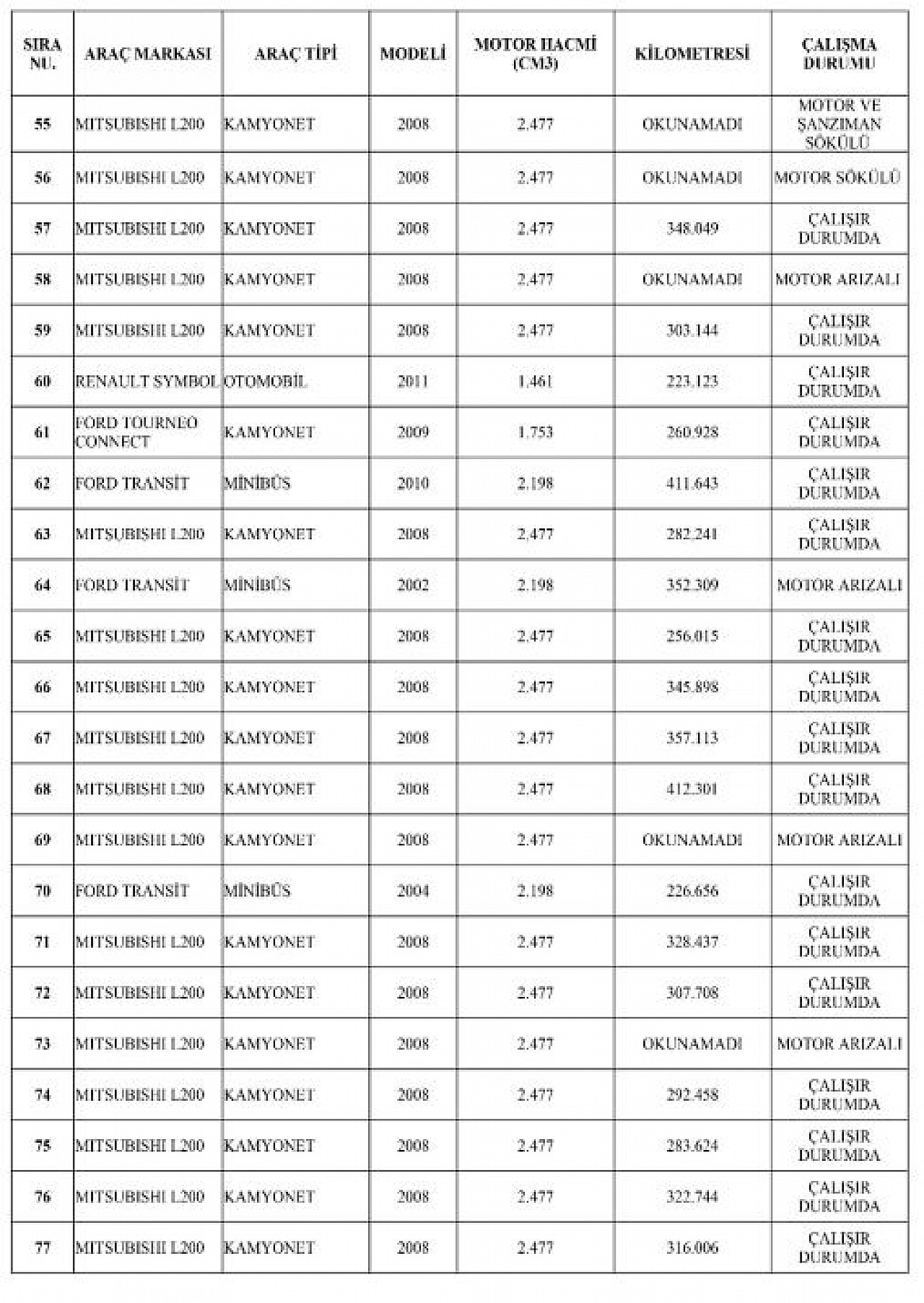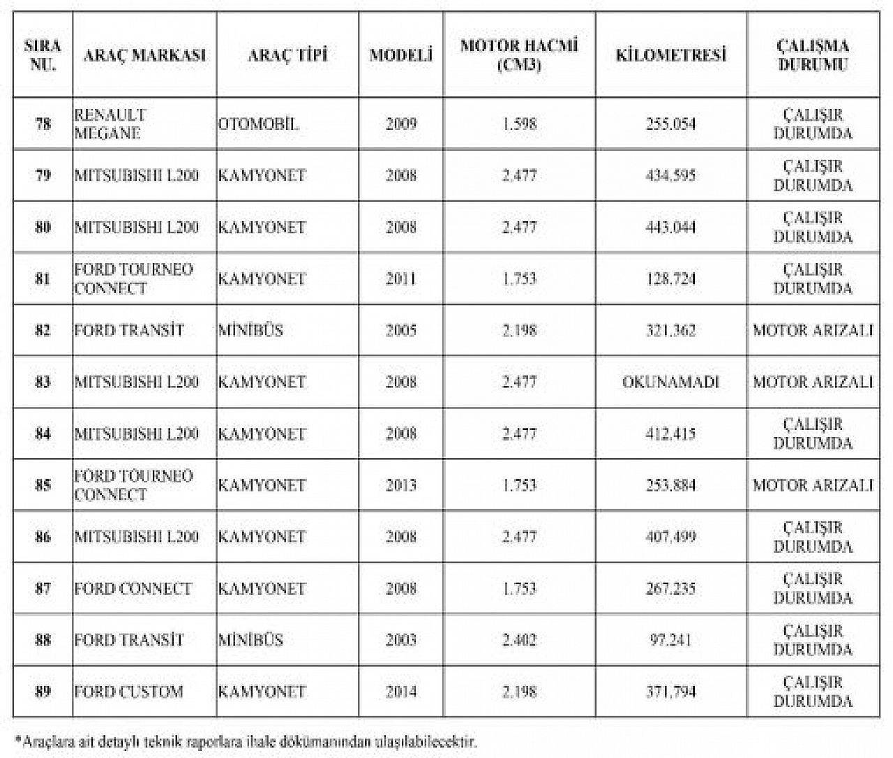 Verilecek Araçlar (89 Adet): Muhtelif marka ve cinste, işletme ve idamesi etkin olmayan araçlar.