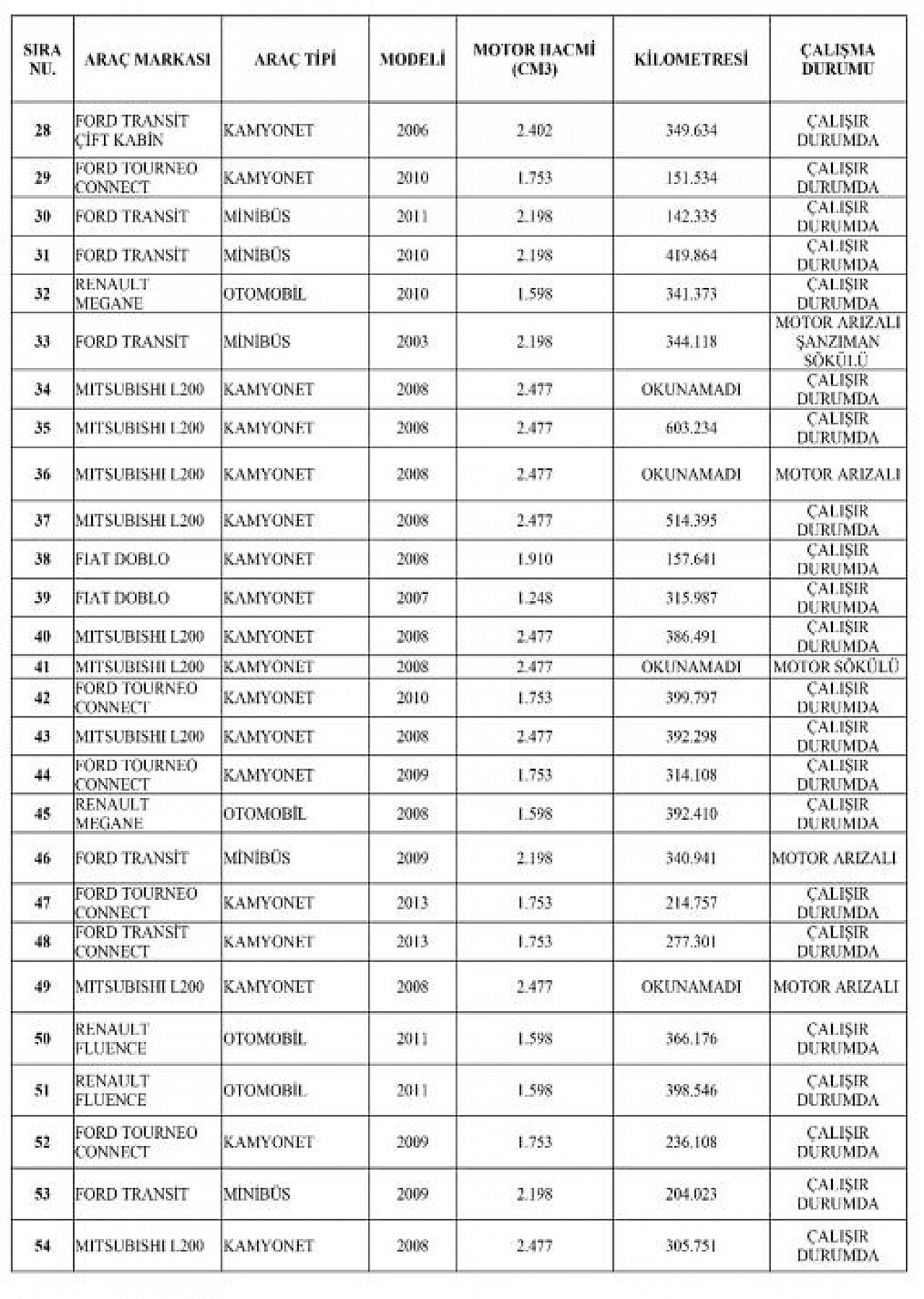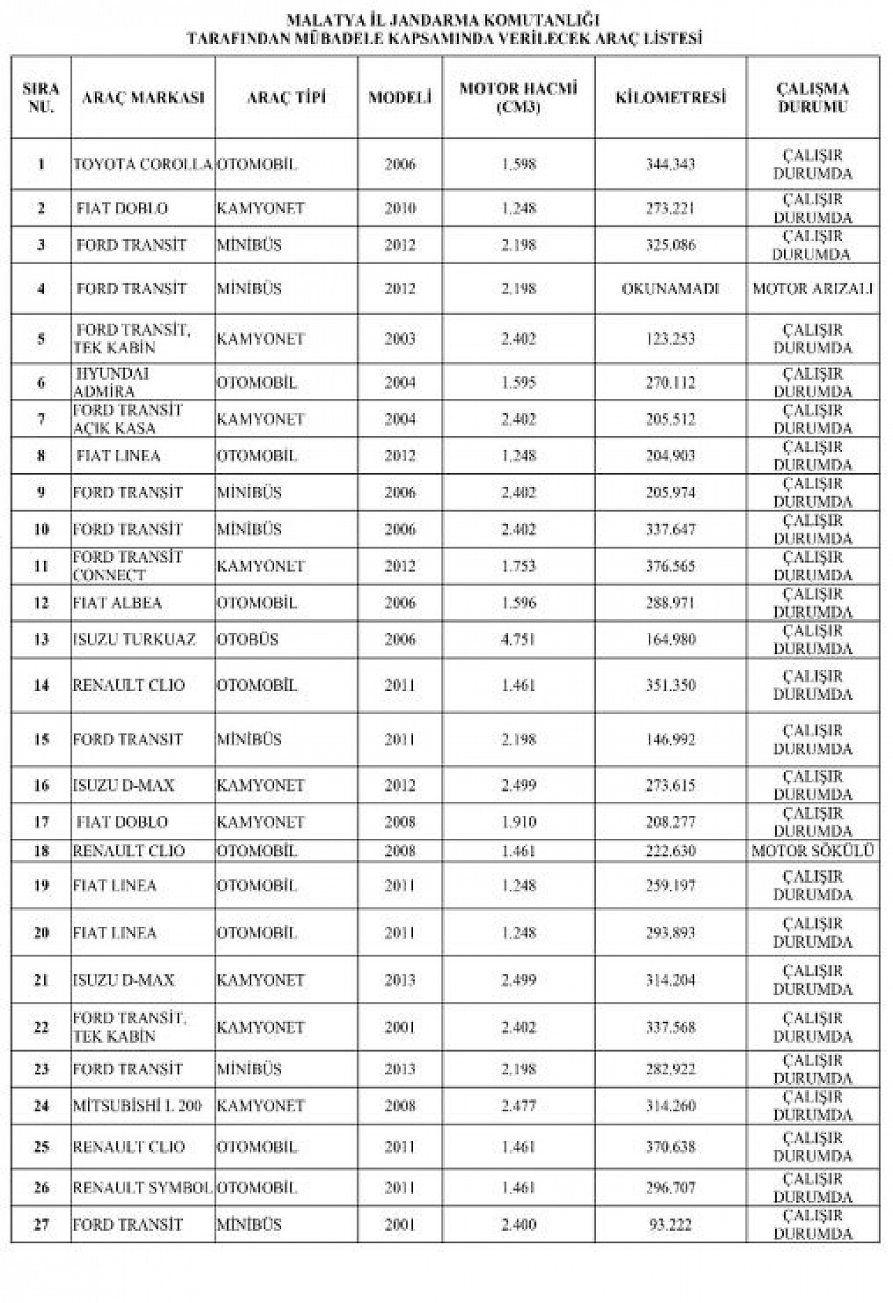 Cumhurbaşkanı Recep Tayyip Erdoğan’ın imzasıyla 4 Kasım 2025 tarihli Resmî Gazete’de yayımlanan kararla Malatya İl Jandarma Komutanlığı, hizmetinde kullanılan çalışır durum ve motor arızalı 89 adet aracı mübadele yoluyla satışa çıkarıyor.