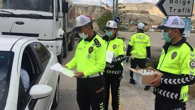 Malatya'nın Darende ilçesinde Trafik Haftası nedeniyle düzenlenen etkinlikte sürücülere dezenfekte ve kolonya dağıtıldı.