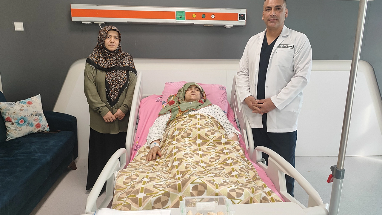 Malatya'da diz ağrısı ve hareket kısıtlılığı şikayetiyle hastaneye başvuran 73 yaşındaki Elif Büyükbirer'in dizinden, yapılan ameliyatta 24 adet taşlaşmış tümör çıkarıldı.