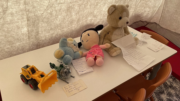 Bu arada, Van'dan gönderilen ve çadır kentte dağıtılan yardım malzemeleri ve oyuncaklar arasındaki notlar da dikkati çekiyor.