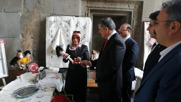 Tarihi Çifte Minareli Medrese’de el emeği göz nuru eserleri inceleyen Erzurum Valisi Mustafa Çiftçi, emeği geçenlere teşekkür etti. Pasinler Halk Eğitim Merkezi standını da gezen Vali Çiftçi, kurs hocası Sema Babagil’den bilgi aldı.