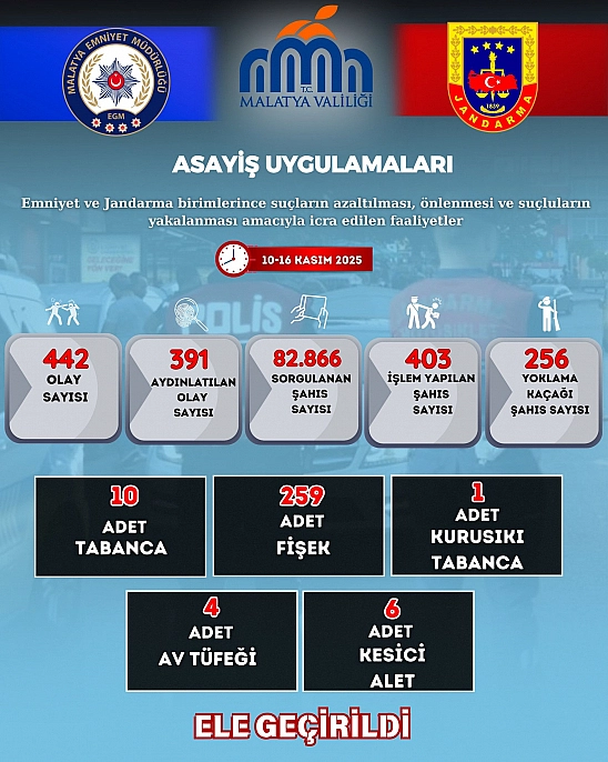 Malatya İl Emniyet Müdürlüğü, 10-16 Kasım tarihleri arasında gerçekleştirilen asayiş operasyonlarının verilerini paylaştı. Operasyonlarda 26 gram metamfetamin, 15 bin 671 adet sentetik ecza, 368 gram sentetik kannabinoid 15 ecstays 3 bin 946 gr esrar ve 22 gr kenevir tohumu ele geçirildi.