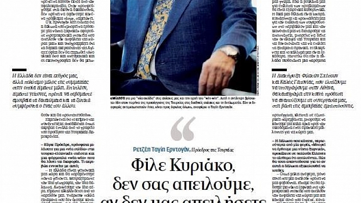 Cumhurbaşkanı Recep Tayyip Erdoğan, Atina ziyareti öncesinde Yunan Kathimerini gazetesine verdiği röportajda, 'Kiryakos, dostum, siz bizi tehdit etmedikçe biz de sizi tehdit etmiyoruz. Gel iki ülke arasındaki güveni sağlamlaştıralım' dedi.