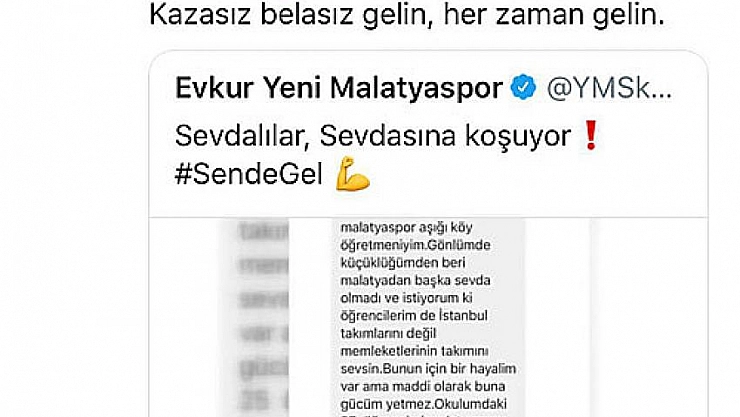 Yeni Malatyaspor Kulübünden yapılan açıklamaya göre Darende Irmaklı Ortaokulunda öğretmenlik yapan Selim Yavuz, öğrencilerinin Spor Toto Süper Lig'de mücadele eden Evkur Yeni Malatyaspor'un maçını izleyebilmesi için kulübün medya direktörü Ali Karadeniz ile sosyal medyadan iletişime geçti. Yılmaz, sosyal medyadan gönderdiği mesajda öğrencilerinin Malatya'nın herhangi bir maçında tribünlerde misafir edilmesini talep etti. İsteğe duyarsız kalmayan Yeni Malatyaspor Kulübü Başkanı Adil Gevrek, Yılmaz öğretmen ve öğrencilerinin hayalini gerçekleştirmek için onlara Passolig kartı çıkartılmasını sağladı. Öğrencilerin, bugün yapılacak Evkur Yeni Malatyaspor-Antalyaspor karşılaşmasında tribünde yer alacağı öğrenildi.