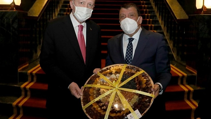 Başkan Gürkan ziyarette Erdoğan’a Şam çeliği, Damascus çeliği olarak da bilinen Damascus kılıcı hediye etti.