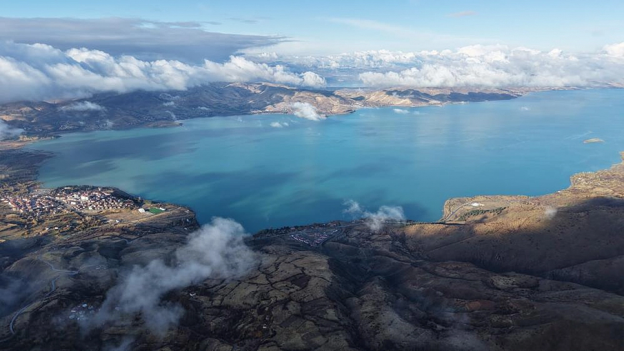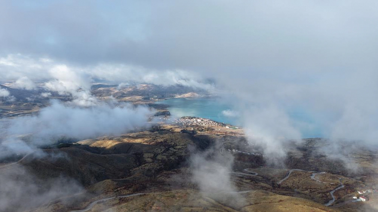 Elazığ'da soğuk havayla birlikte önceki gün 2 bin 347 rakımlı Hazarbaba Dağı'na kar yağdı. Dağ ve etekleri beyaza bürünürken, Hazar Gölü ise mavi tonuyla dikkat çekti. Bulutların ve sisin de hakim olduğu bölgede adeta kartpostallık görüntüler oluştu. Dron ile çekilen görüntüler izleyenleri kendine hayran bıraktı. Bazı vatandaşlar ise Hazarbaba Dağı'na çıkarak manzaranın keyfini yaşadı.
