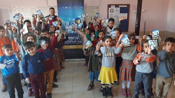 Karne dağıtımı esnasında jandarma tarafından öğrencilere çikolata, trafik dedektifleri kartı ve trafik bilgilendirme broşürleri dağıtıldı.