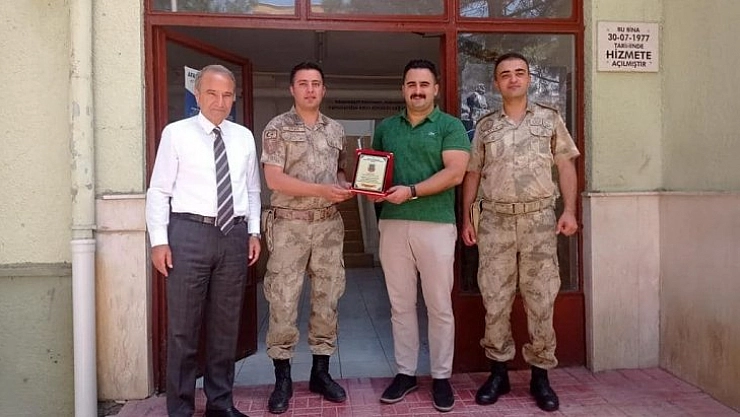 Kaymakam Ülkü, tayini çıkan jandarma personellerine ilçeye göstermiş olduğu fedakar çalışmaları nedeniyle plaket vererek yeni görevlerinde başarı dileklerinde bulundu.