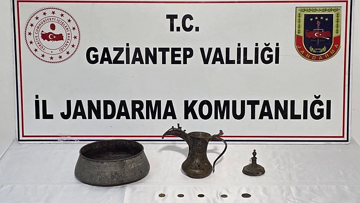 Gaziantep İl Jandarma Komutanlığı ekipleri, tarihi eser kaçakçılığının önlenmesine yönelik Gaziantep Cumhuriyet Başsavcılığı koordinesinde çalışma yaptı. Çalışma çerçevesinde, Nizip ve Şahinbey ilçelerinde icra edilen önleyici kolluk devriyesi esnasında define bulmak amacıyla izinsiz kazı yaptığı tespit edilen Ş.T., M.Ç., K.B., H.B. ve M.E. isimli şüpheliler suçta kullandıkları malzemeleri ile birlikte suçüstü yakalanarak gözaltına alındı. Yapılan aramada, 5 adet tarihi eser niteliğinde sikke, 1 adet tarihi eser niteliğinde kazan, 1 adet tarihi eser niteliğinde ibrik, 2 adet alan tarama anteni, 1 adet karot makinası, 3 adet karot makina ucu, 2,5 litre benzin ele geçirildi. Kazı malzemelerine el konularak şüpheli şahıslar hakkında yasal işlem başlatıldı.