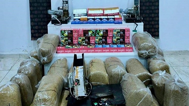 KOM ekiplerince depoda yapılan aramada; 3 elektrikli sigara sarma makinesi, 6 bin 600 boş ve doldurulmuş makaron, 5 bin 500 boş sigara paketi, 210 mükerrer bandrol ve 217 kilo 500 gram kıyılmış tütün ele geçirildi.