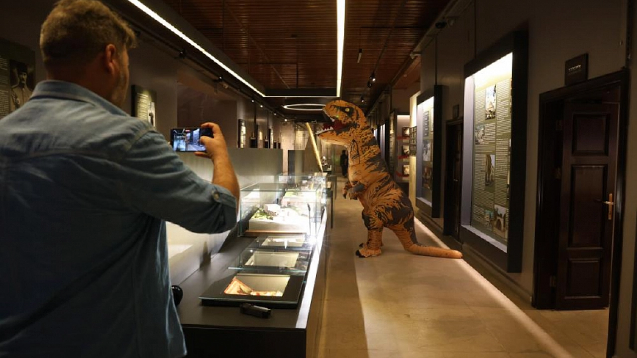 Elazığ Kent Müzesi'ne dinozor kostümüyle gelen 17 yaşındaki lise öğrencisi, ziyaretçilerin ilgi odağı oldu. Çocuklar hem fotoğraf çektirdi hem de Elazığ yöresine ait alanda, dinozorla birlikte halay çekti.