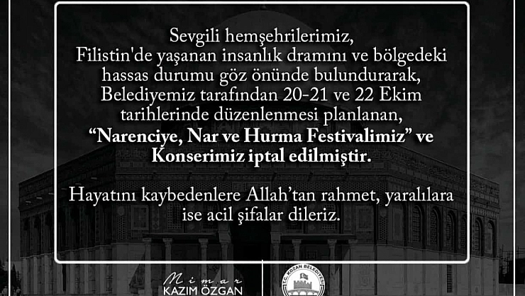 Kozan Belediye Başkanlığı tarafından yapılan yazılı açıklamada, “Sevgili hemşehrilerimiz, Filistin'de yaşanan insanlık dramını ve bölgedeki hassas durumu göz önünde bulundurarak, Belediyemiz tarafından 20-21 ve 22 Ekim tarihlerinde düzenlenmesi planlanan, “Narenciye, Nar ve Hurma Festivali” ve konserimiz iptal edilmiştir. Hayatını kaybedenlere Allah’tan rahmet, yaralılara ise acil şifalar dileriz” denildi.