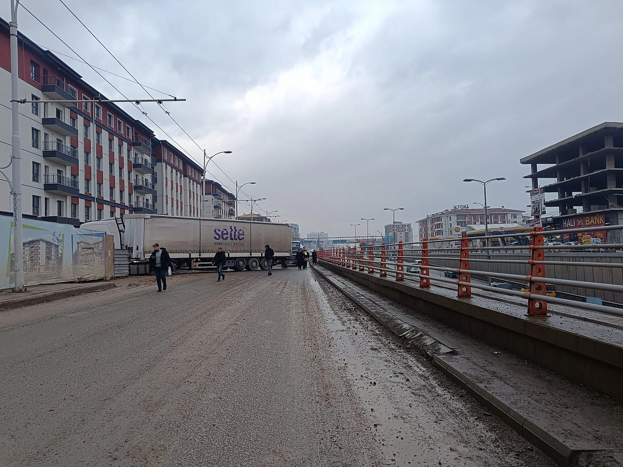 Malatya'nın Battalgazi ilçesi Turgut Temelli Caddesi'nde çamura batan tır, yolu trafiğe kapattı. Olay nedeniyle trafikte uzun kuyruklar oluşurken, toplu taşıma araçlarında bulunan vatandaşlar çamurlu yolları yürümek zorunda kaldı.