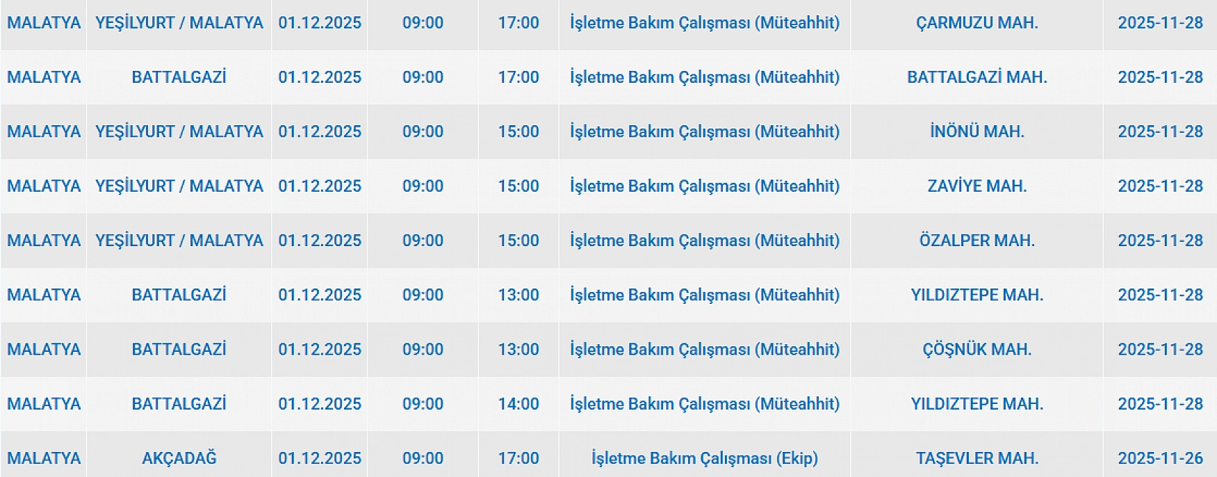 Malatya'da 1 Aralık'ta 2025 Pazartesi günü Doğanşehir, Akçadağ, Yeşilyurt, Hekimhan, Battalgazi ilçelerinde planlı bakım çalışmaları nedeniyle elektrik kesintisi yaşanacak. İşte elektrik kesintisi yaşayacak mahalleler…