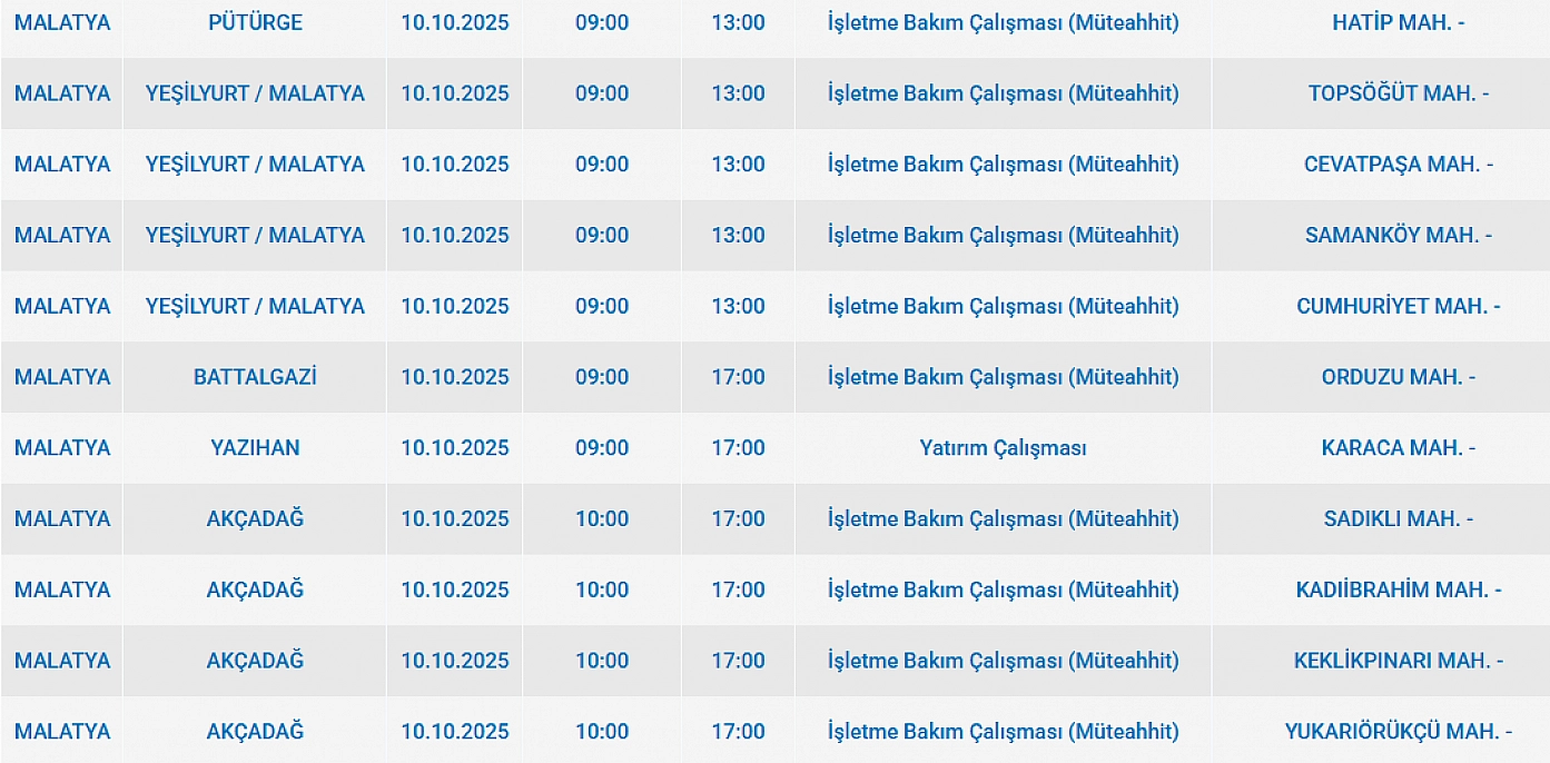 Malatya'da 10 Ekim 2025 Cuma günü Yeşilyurt, Battalgazi, Pütürge ilçelerinde planlı bakım çalışmaları nedeniyle elektrik kesintisi yaşanacak. İşte elektrik kesintisi yaşayacak mahalleler…