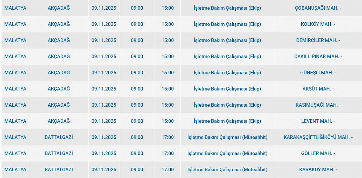 Malatya'da 10 Kasım 2025 Pazar günü Pütürge, Akçadağ, Doğanşehir, Battalgazi ilçelerinde planlı bakım çalışmaları nedeniyle elektrik kesintisi yaşanacak. İşte elektrik kesintisi yaşayacak mahalleler…
