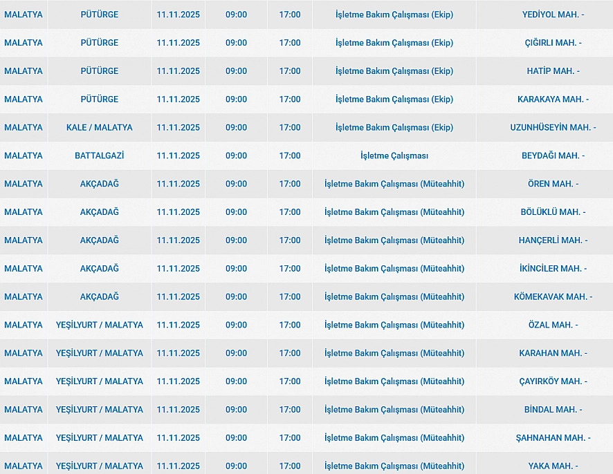 Malatya'da 11 Kasım 2025 Salı günü Battalgazi, Akçadağ, Pütürge, Kale, Yeşilyurt ilçelerinde planlı bakım çalışmaları nedeniyle elektrik kesintisi yaşanacak. İşte elektrik kesintisi yaşayacak mahalleler…