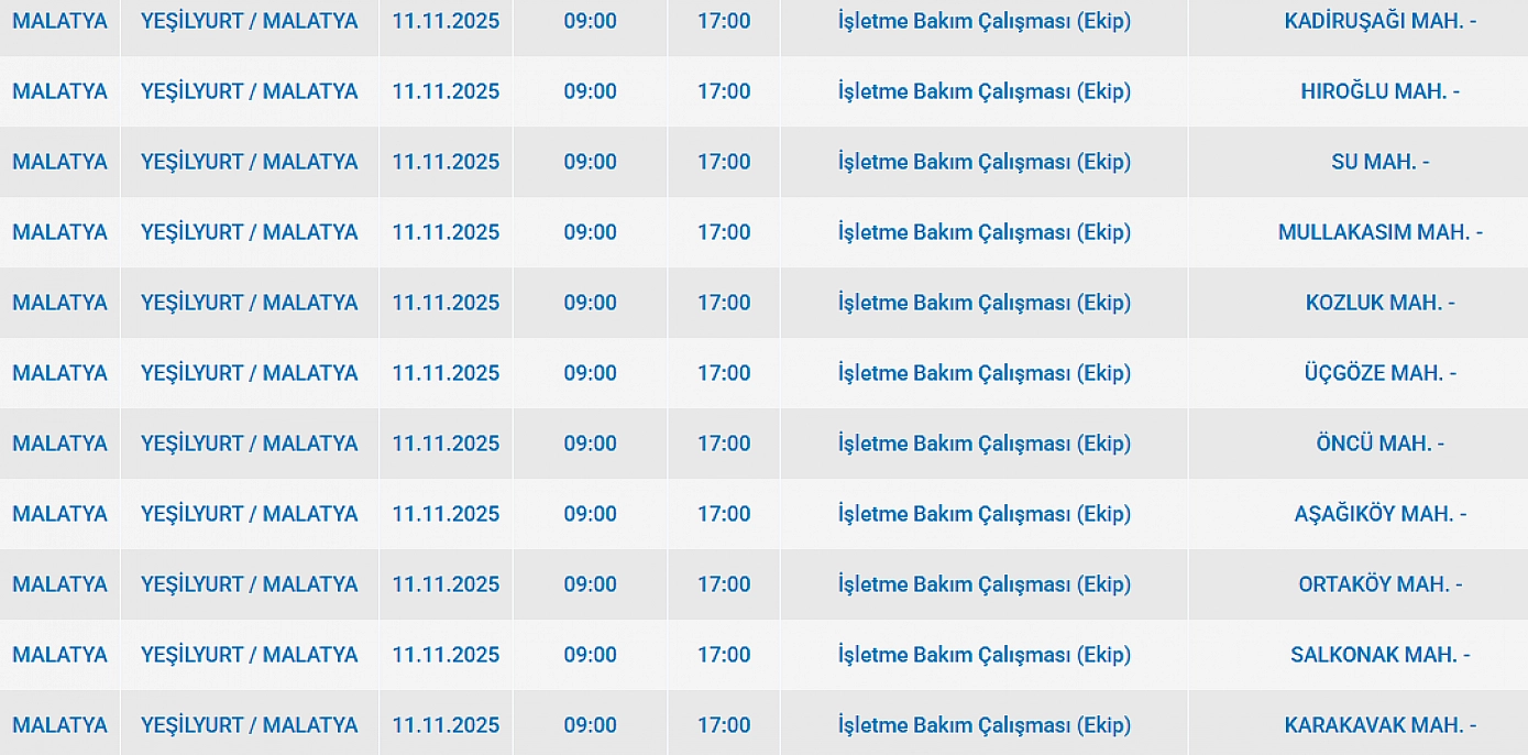 Malatya'da 11 Kasım 2025 Salı günü Battalgazi, Akçadağ, Pütürge, Kale, Yeşilyurt ilçelerinde planlı bakım çalışmaları nedeniyle elektrik kesintisi yaşanacak. İşte elektrik kesintisi yaşayacak mahalleler…