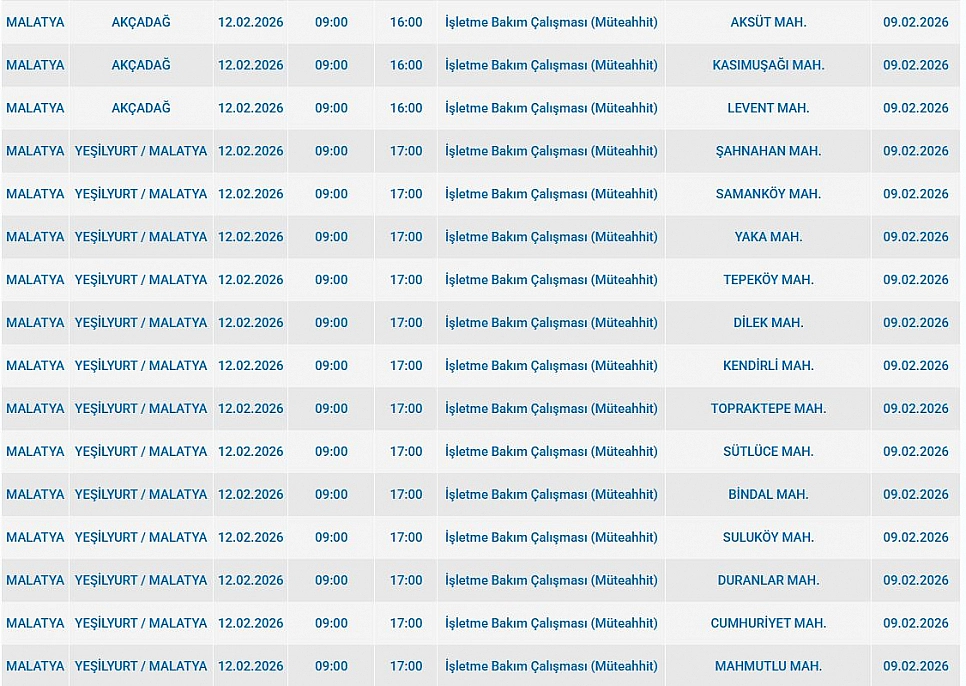 Malatya'da 12 Şubat 2026 Perşembe günü Yeşilyurt, Battalgazi ve Akçadağ ilçelerinde planlı bakım çalışmaları nedeniyle elektrik kesintisi yaşanacak. İşte elektrik kesintisi yaşayacak mahalleler…