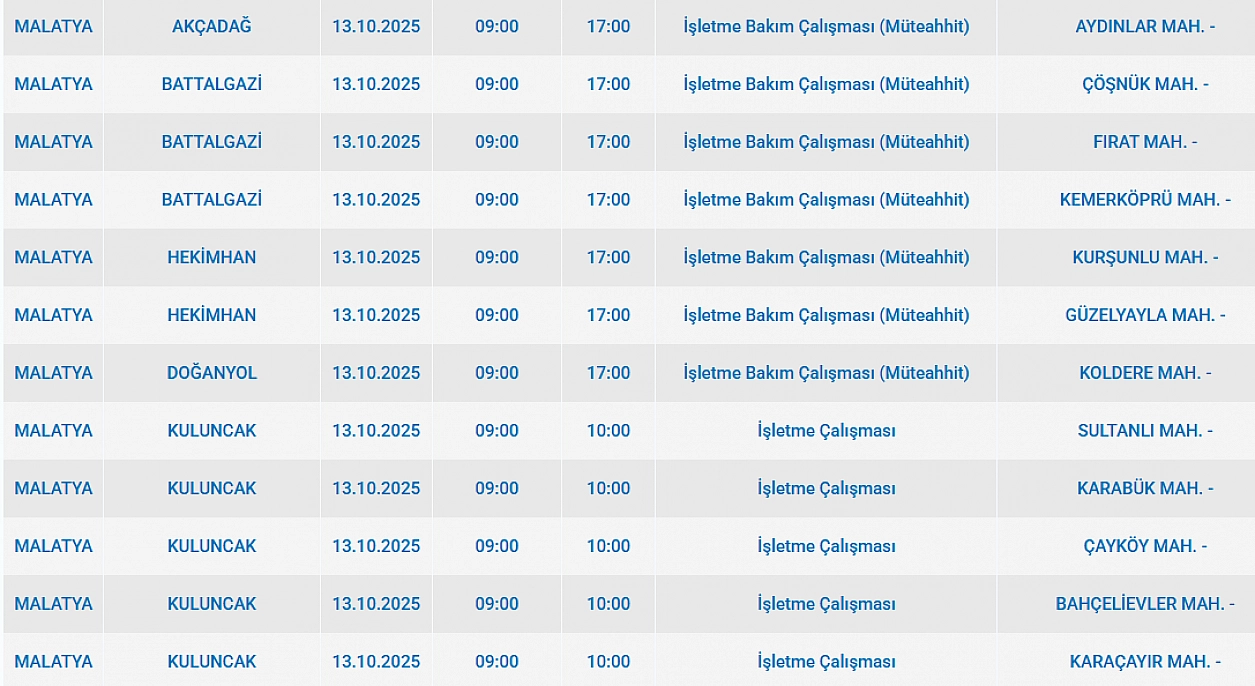 Malatya'da 13 Ekim 2025 Pazartesi günü Akçadağ, Doğanşehir, Arguvan, Yeşilyurt, Battalgazi, Hekimhan, Doğanyol, Kuluncak ilçelerinde planlı bakım çalışmaları nedeniyle elektrik kesintisi yaşanacak. İşte elektrik kesintisi yaşayacak mahalleler…