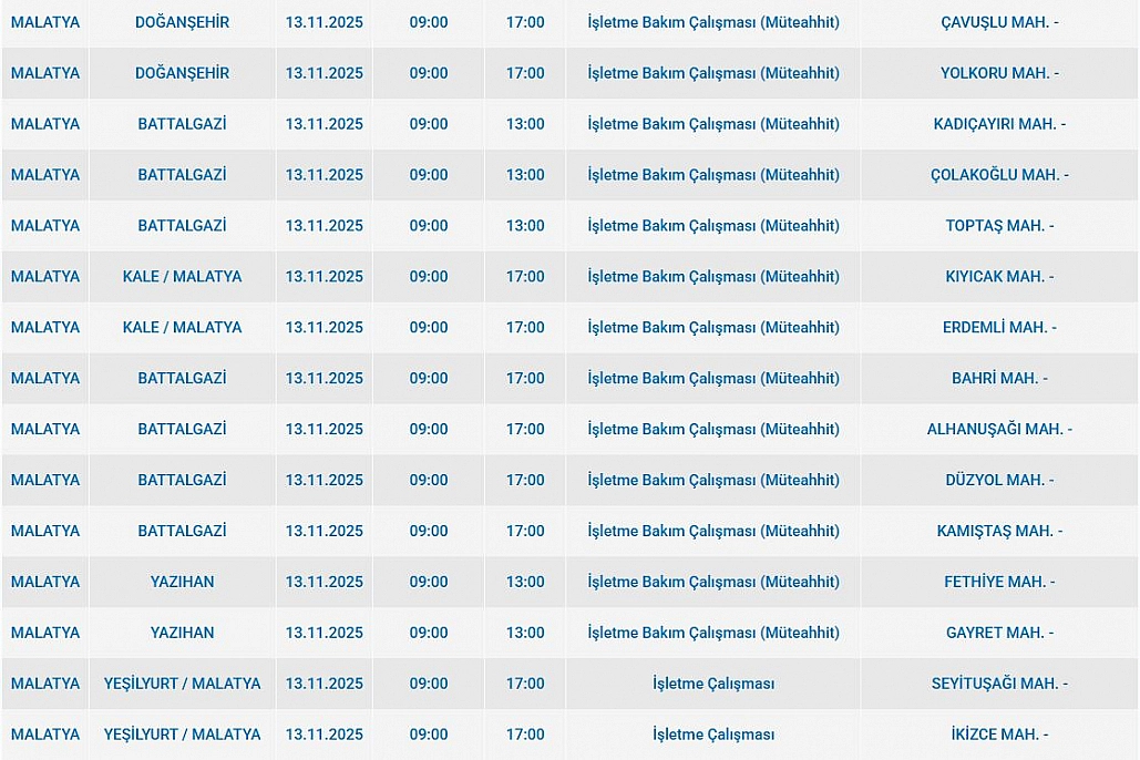 Malatya'da 13 Kasım 2025 Perşembe günü Battalgazi, Akçadağ, Doğanşehir, Arguvan, Hekimhan Yazıhan, Pütürge, Kale, Yeşilyurt ilçelerinde planlı bakım çalışmaları nedeniyle elektrik kesintisi yaşanacak. İşte elektrik kesintisi yaşayacak mahalleler…
