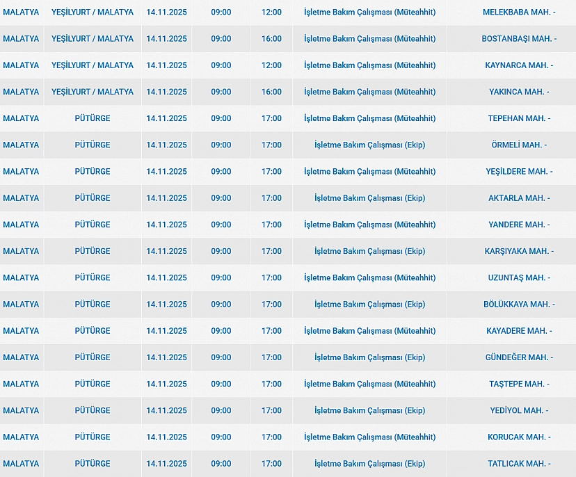 Malatya'da 13 Kasım'da 2025 Cuma günü Yeşilyurt, Pütürge, Battalgazi, Kale, Doğanşehir, Akçadağ, Darende, Yazıhan, Hekimhan ilçelerinde planlı bakım çalışmaları nedeniyle elektrik kesintisi yaşanacak. İşte elektrik kesintisi yaşayacak mahalleler…