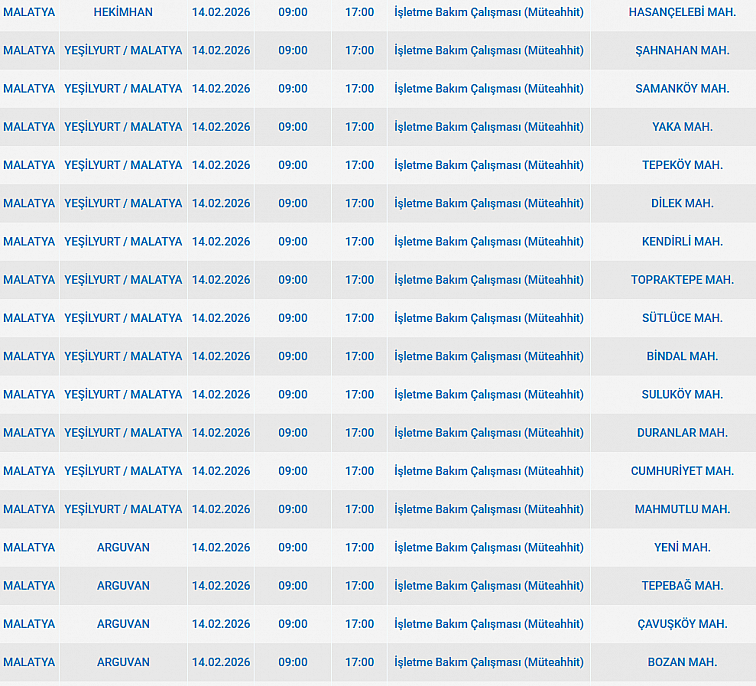 Malatya'da 14 Şubat 2026 Cumartesi günü Arapgir, Hekimhan, Arguvan, Yeşilyurt ilçelerinde planlı bakım çalışmaları nedeniyle elektrik kesintisi yaşanacak. İşte elektrik kesintisi yaşayacak mahalleler…