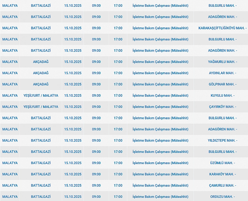 Malatya'da 15 Ekim 2025 Çarşamba günü Battalgazi, Akçadağ, Yeşilyurt ilçelerinde planlı bakım çalışmaları nedeniyle elektrik kesintisi yaşanacak. İşte elektrik kesintisi yaşayacak mahalleler…
