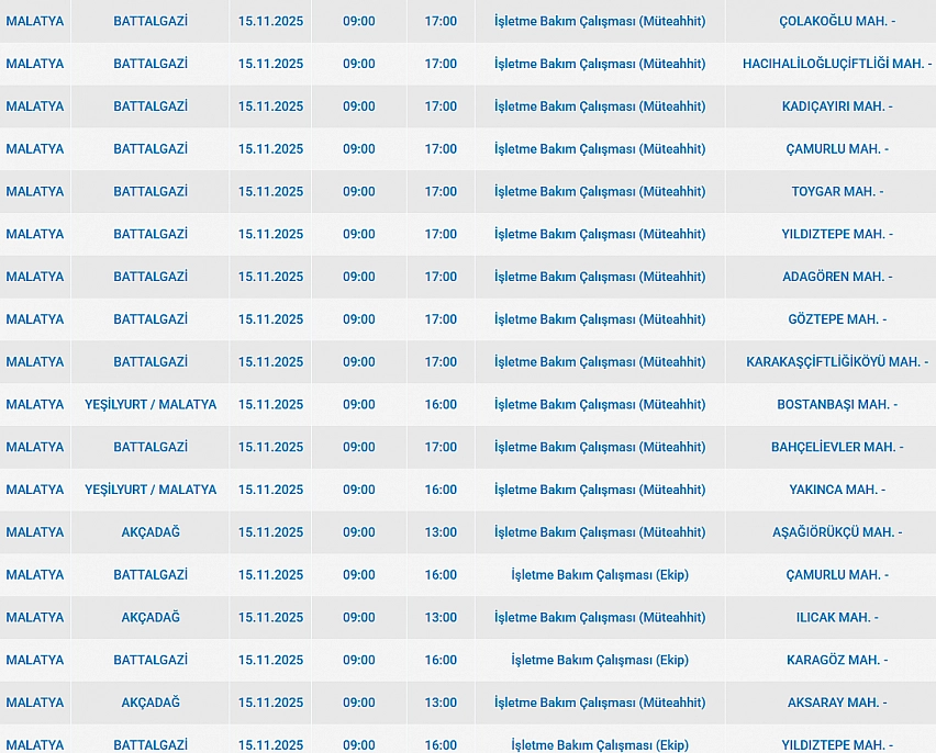 Malatya'da 15 Kasım 2025 Cumartesi günü Battalgazi, Yeşilyurt, Akçadağ, Doğanşehir ilçelerinde planlı bakım çalışmaları nedeniyle elektrik kesintisi yaşanacak. İşte elektrik kesintisi yaşayacak mahalleler…