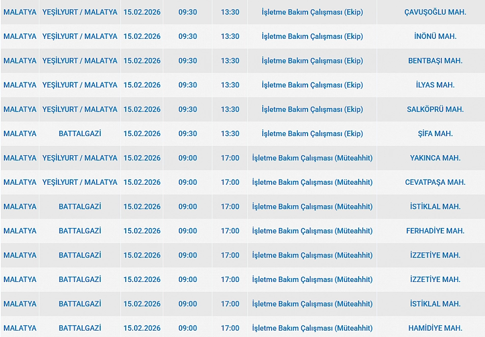Malatya'da 15 Şubat 2026 Pazar günü Battalgazi, Yeşilyurt, Akçadağ, Doğanşehir ilçelerinde planlı bakım çalışmaları nedeniyle elektrik kesintisi yaşanacak. İşte elektrik kesintisi yaşayacak mahalleler…